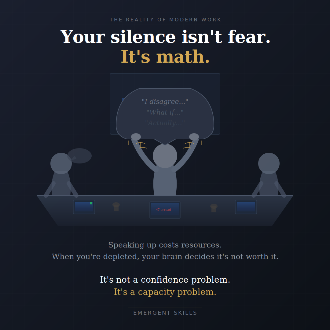 Speaking up isn't free. It costs cognitive load to organize your thoughts under pressure. Emotional bandwidth to handle pushback. Executive function to manage being seen as "difficult."